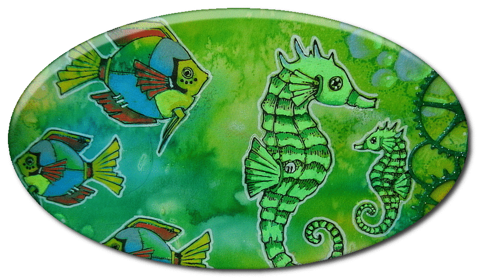 ReplyDeleteGoodness what a delight in greens - your seahorses almost seem to glow amid the background you created which is so evocative of bubbles. The splashes of red & blue on the fish add lovely interest as do the die-cut gears. I particularly like the way your bottomost gears are placed to lead the eye to the sentiment as well as being in a dark bold colour to match it.
