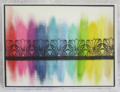 Her final card was created by using several different colours of Distress Crayons, she smeared strips down the card using her fingers. She then stamped one of the borders from the Decorative Edges stamp set across the coloured strip.