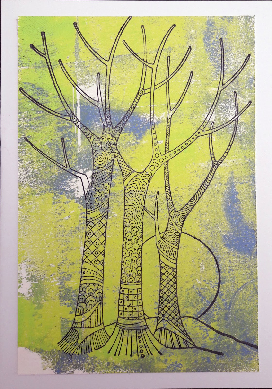 Dominike has created a series of cards using the Tangled Birch stamp. She has used gelli plate backgrounds for the first four, and stamped onto tissue paper in a journal for her final project. The addition of postage stamps is a lovely idea, and adds great texture to these cards: