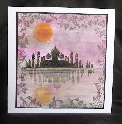 For this design it is easier to start with the reflective image so ink up your solid Palace stamp from Indian Textile with Onyx Black Versafine and then take a brayer and roll over the image, width ways so the inky image has been transferred to the brayer.