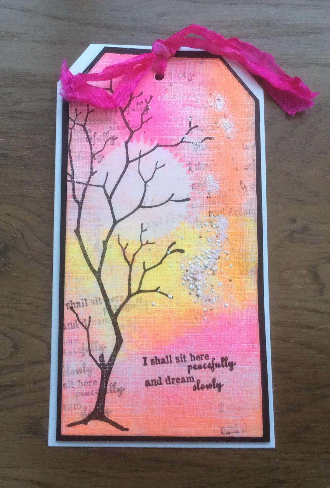 My final card I used Linen textured cardstock and a nesting tag die. I simply brayered neon acrylic paints in a very random fashion, whilst still slightly wet I used a starburst type stencil from my stash and a damp cloth removed some of the paint, simple stamping and some chunky EP for texture.