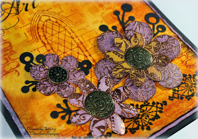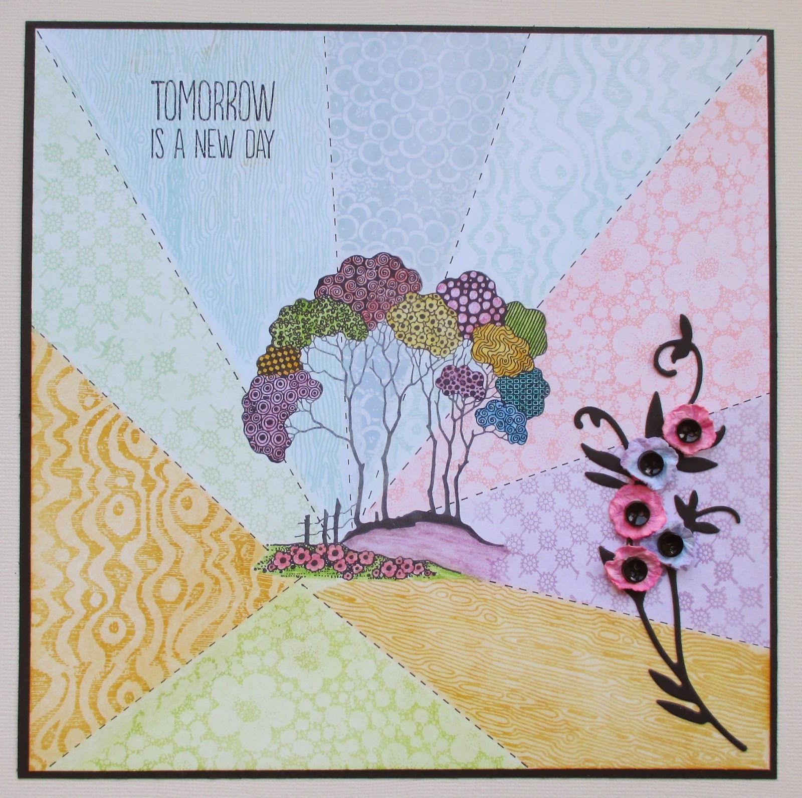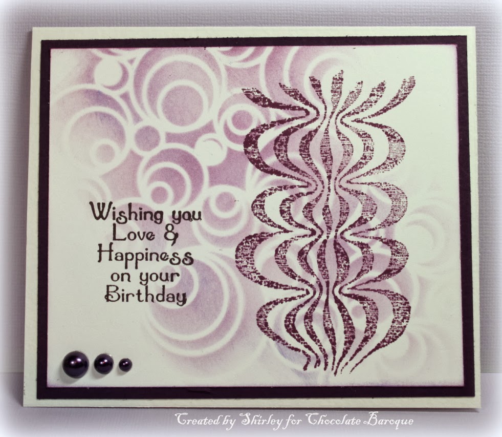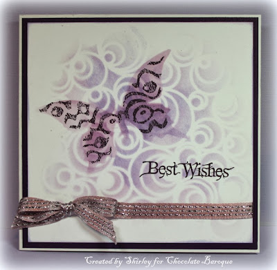 For this card I have just stamped the frilly ribbon and the sentiment directly onto the card and added a hint of color on the ribbon using water color crayons. The flowers have been stamped onto separate card stock and cut out. The card has been made up as seen with foam pads behind the stamped flowers and the addition of a little die cut.