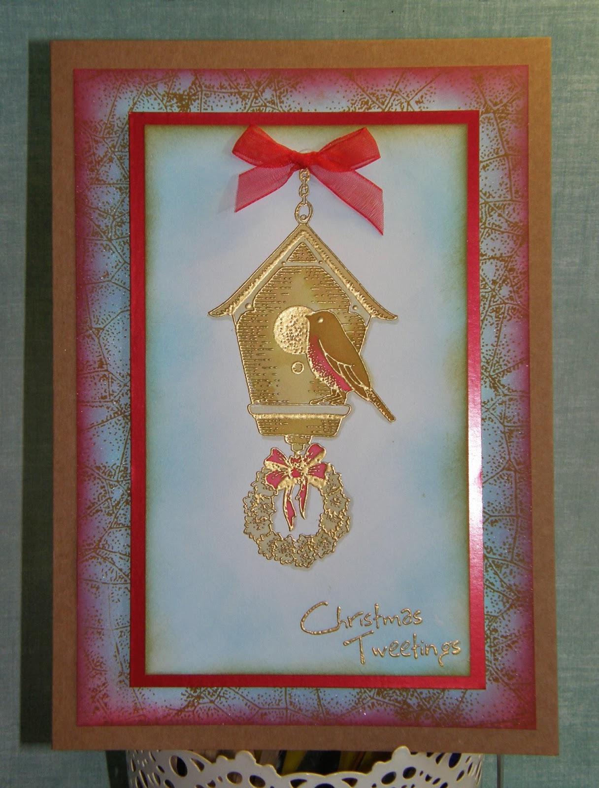 For this card I started by stamping the sentiment and the lace trim. I then stamped and cut out all of my pieces and decoupaged them onto the base card using foam tabs.