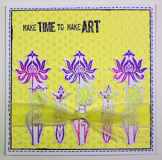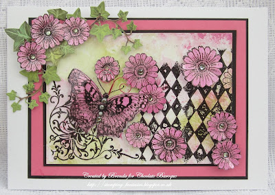 I started by stamping Briar Rose Butterfly several times onto tissue paper which I then cut out and coloured with sparkle pens, I found the consistency of the pens perfect as the liquid blended over the tissue without tearing it. Next I used black archival ink to stamp some leaves to give contrast.