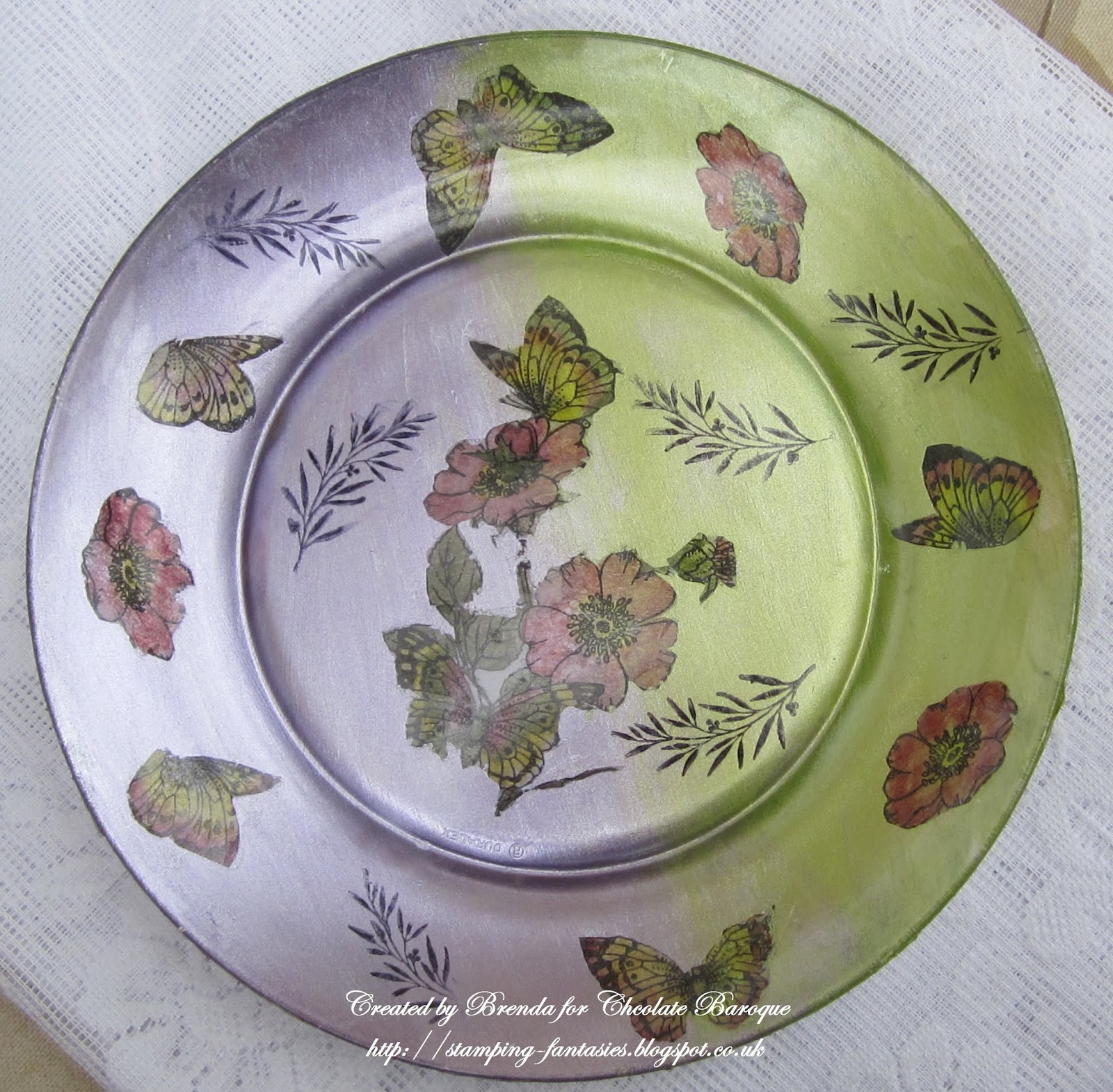 Next I adhered the tissue to the plate making making sure the coloured side was placed against the glass, I used a dried clear decoupage glue for this. When dry I pained the whole of he back of the plate with metallic acrylic paint. I am not totally happy with this one especially the blending of the pain, but it was a good starting point to try and master the technique.............be warned I have more plates waiting for be decorated.