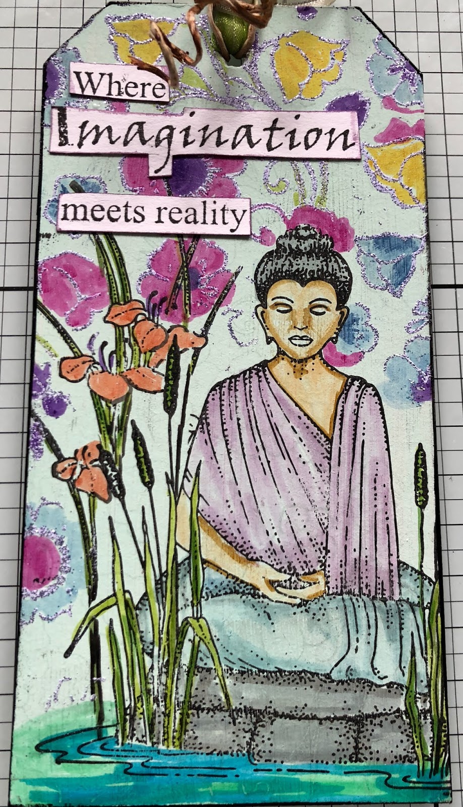 I stamped my main focal point from the Tranquility stamp set and then repeated the stamp onto masking Tissue, cut around the design, and stuck it over the image on the tag. I then repeated this with the flowers. Once both images were masked, using Big Bold Background Belle Flowers and Versamark, I stamped over the masked areas, then sprinkled with a glitter embossing powder and heated it to melt the powder. I then removed the masking tissue to reveal the stamped images below.