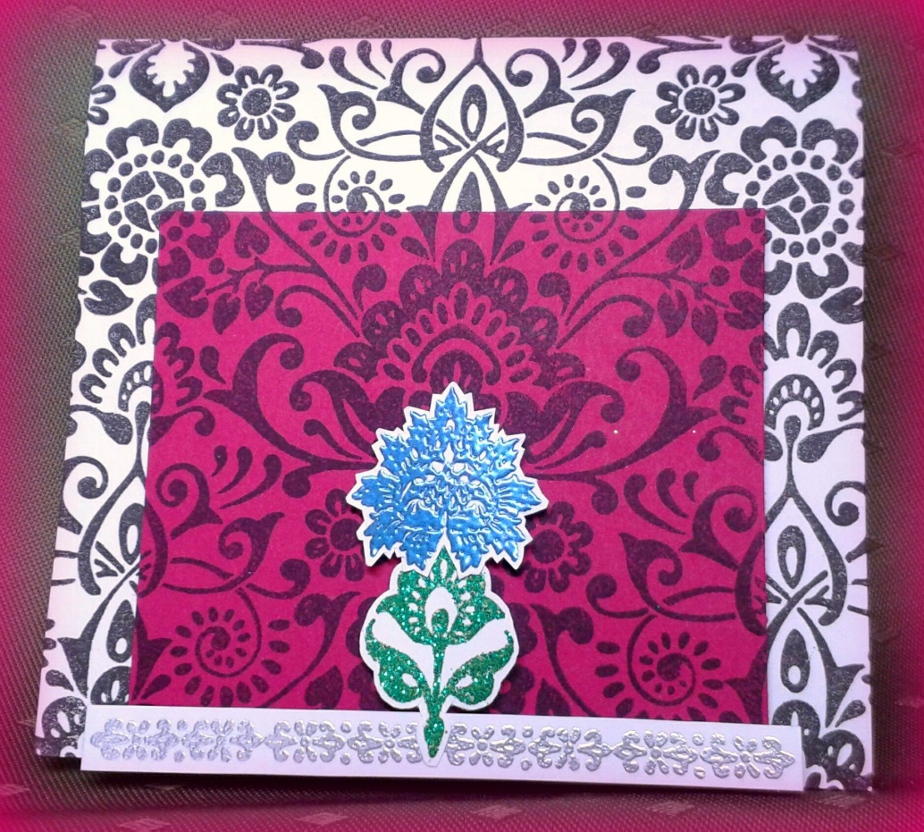 What a wonderful way to welcome Spring! Chocolate Baroque has made some fantastic new floral stamps, but in a larger background size! I have made a sample using the Floral Damask background. This card is 5" by 5 1/4" square, and the background stamp covered it, plus some! I stamped it twice, once in black ink on white cardstock, then again in black on burgundy cardstock. The two flowers in the center were heat embossed, as well as the little border at the bottom. The two flowers are just a sneaky-peek at what's to come!