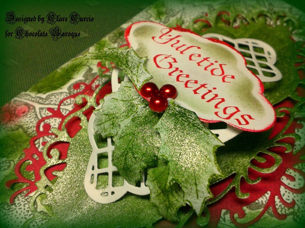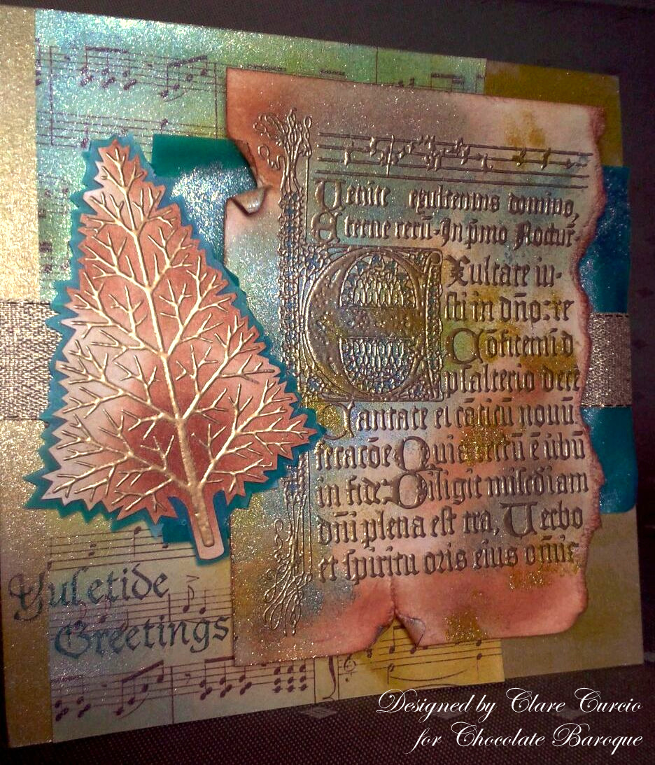 I created the background with PanPastels and stamped in the Edge stamp but instead of using it as one stamp I inked up part of the stamp and stamped part of the image at each side of the card with Sepia Versafine ink. I added the gorgeous large reindeer from Damask Reindeer and watercoloured with distress inks. I added some paper roses dusted with some glitter, some leaves from my stash and some brown organza ribbon.