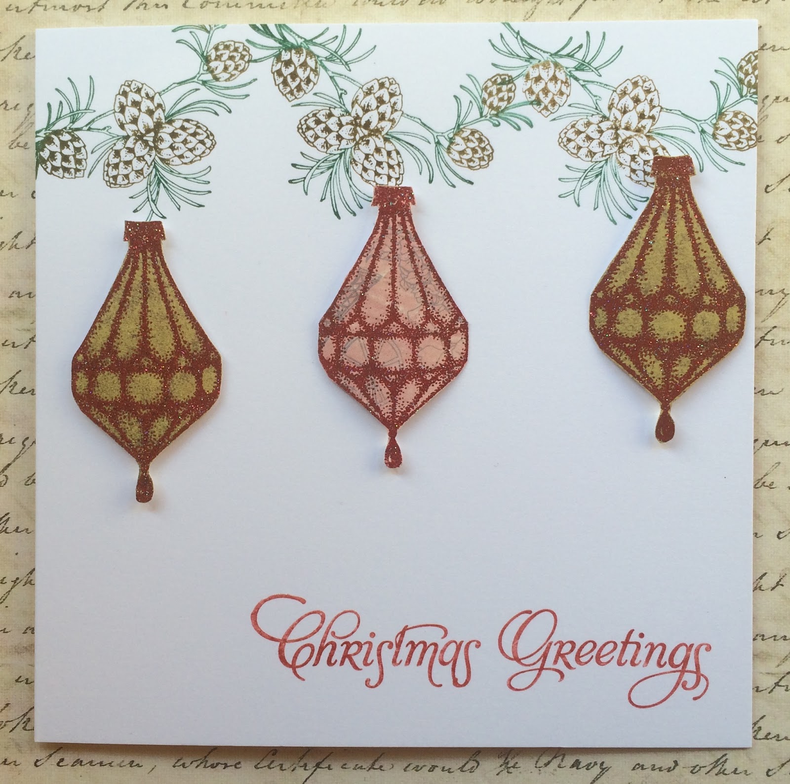 I started my card by stamping the pine cone sprig three times across the top of a white card blank. I coloured the stamp with water based markers so that I could get the variety of colours on the stamp. I added a greeting from the Bold Christmas Words stamp set at the bottom of the card. Finally, I stamped and embossed a bauble from the Christmas Decorations stamp set onto scrapbook paper three times using a sparkly red embossing powder. You always need a bit of sparkle at Christmas!