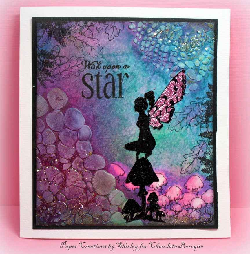 My background (above) started with texture using light molding paste with TCW - Cell Theory stencil and when dry, spraying Dylusions (purple & turquoise) inks. I used images from all three Autumn sets, stamped with black Stazon Ink. I masked the mushrooms, used bleach to remove the ink and added purple Dylusions. I also added glitter around the texture. The Fairy is from the September Fairy set which I stamped and embossed with black on separate card stock, decoupaged and adhered over the background. I added pink stickles to her wings. Wish upon a Star is from Words of Inspiration.