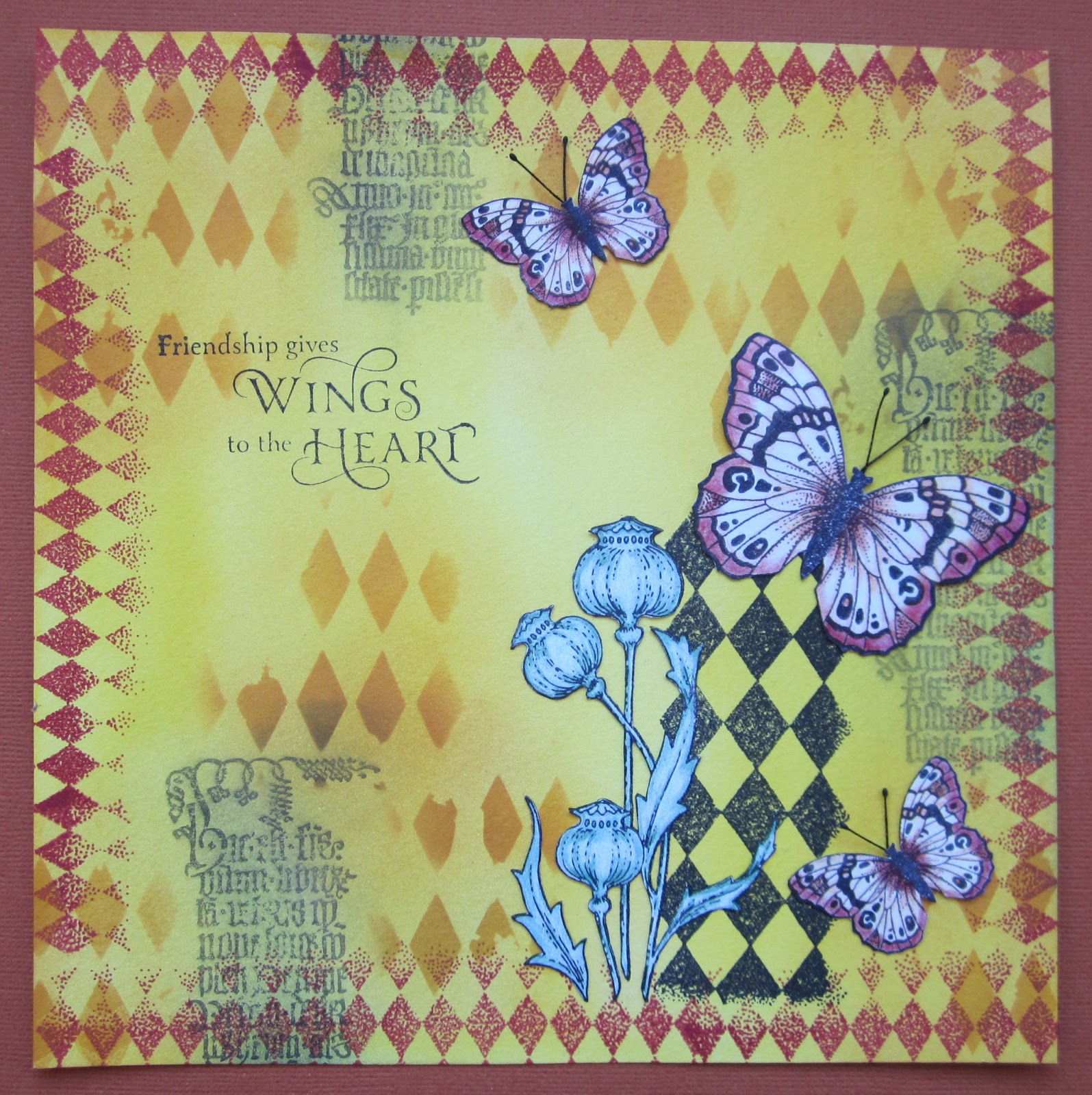 Hi Folks, I have a couple of samples to show you today showcasing the new Clear Edge stamp sets. In my first sample, I have created a sunny background with an ink wash. I then used a harlequin mask and Pan Pastels to start building up my background. I also stamped a script stamp from the Poppy Butterfly Collage stamp sheet using Versafine Ink, and then swiped Pan Pastels over the top. I added a decoupaged poppy and some butterflies from the same stamp sheet to my card, which I coloured with pencils. I created the border by using the harlequin edge stamp from the new Decorative Edges stamp sheet