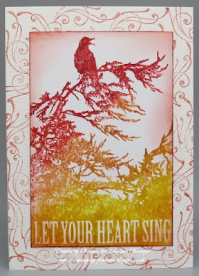 Carole has created a vibrant card using the Dawn Chorus, Wise Owl and Fly Away With Me stamp sets. The background was stamped with Abandoned Coral and Fossilized Amber Distress Inks using various elements from the three sets. the image from Dawn Chorus is stamped with Versafine Onyx Black ink.