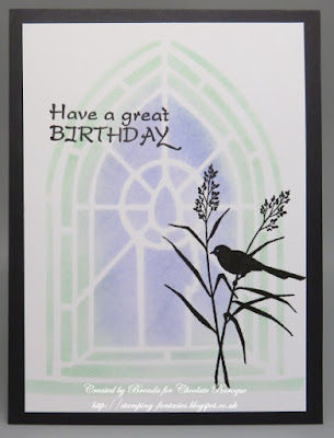 For her final card, she used a window stencil and Distress Inks, then stamped the image and sentiment with Versafine black ink.