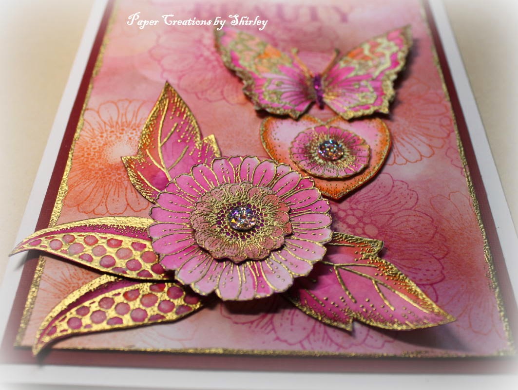 The flowers, leaves, butterfly and heart were embossed with gold, painted with water colour markers, fancy cut (decoupaged) and layered as shown. I used leaves from Sunny Sunflowers and Fresh Blooms. 'Beauty' is from the fabulous Artistic Expressions set, which I use a lot. I added gold embossing power around the edge of the background with a glue pen (& heated).