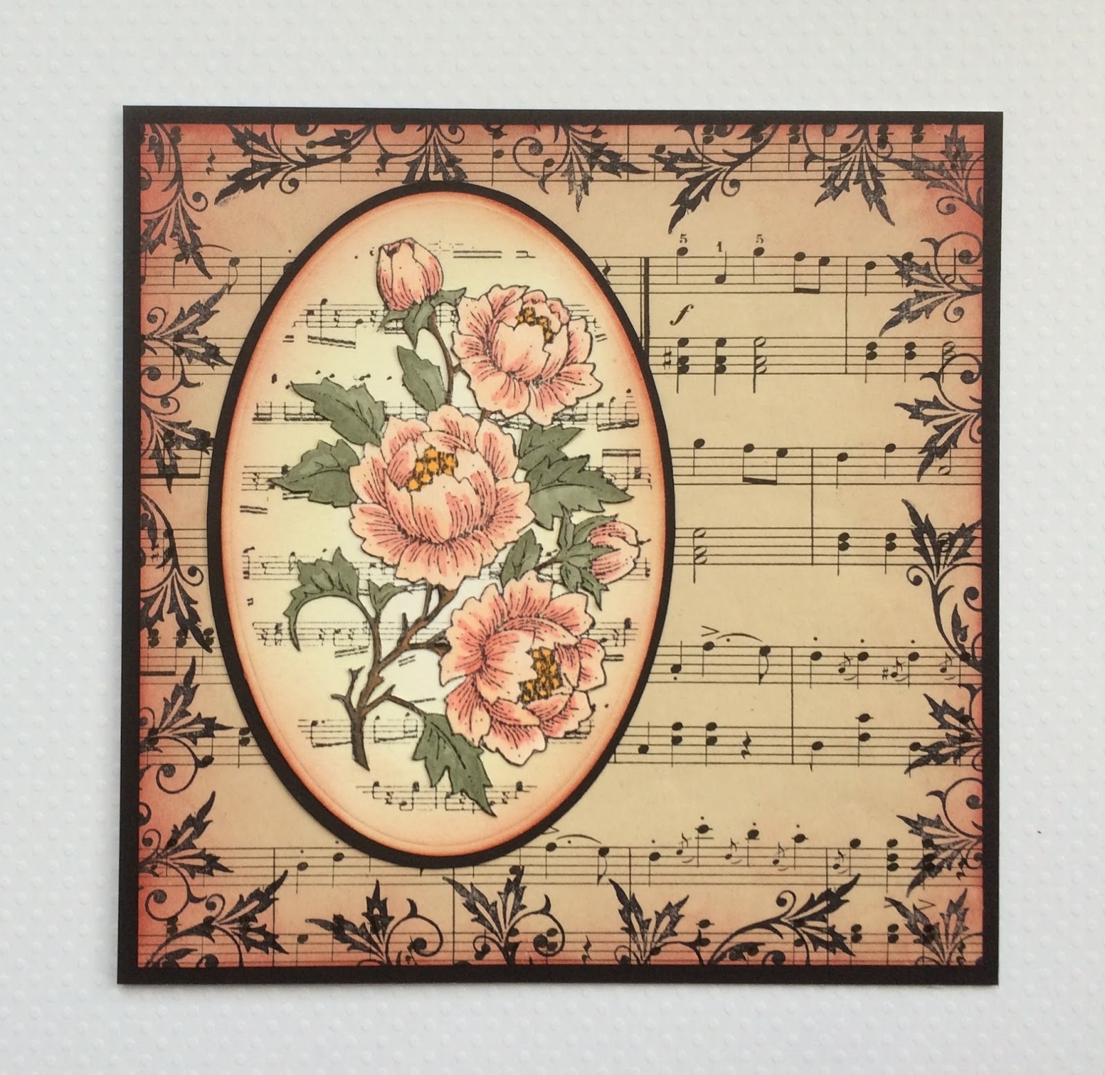 For my first card, I have chosen to use the Flora Musica stamp. I used a piece of vintage music paper, which I trimmed to size, and coloured the edges, using Fired Brick Distress Ink. I then stamped around the edge using an image from the Decadent Brocade stamp set. I cut an oval shape from a piece of smooth card, and coloured this with Antique Linen Distress Ink, and edged it with Fired Brick, as before. I stamped the Flora Musica image onto the shape. I stamped the image again onto another piece of card, and coloured it with alcohol markers, before cutting it out, and attached it to the oval background. I chose black card to mat and layer the panels, as it highlights the pretty edging stamp.