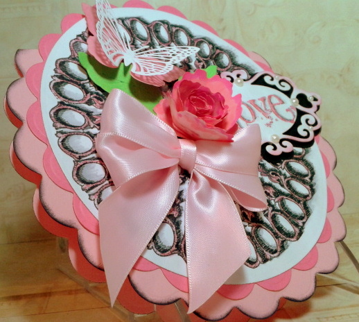 Dress form birdcage – Using the dress form stamp from the Haberdashery stamp set, stamp it twice on white cardstock using the Versafine Onyx inkpad. Cut one out on just the very outside lines, and adhere in the center on lacy flower stamped area. Shade the second one with gray pencil, and fussy-cut out completely, including between the bars of the cage, using hobby knife. Apply small pieces of pop-up dots to the back.