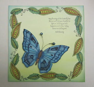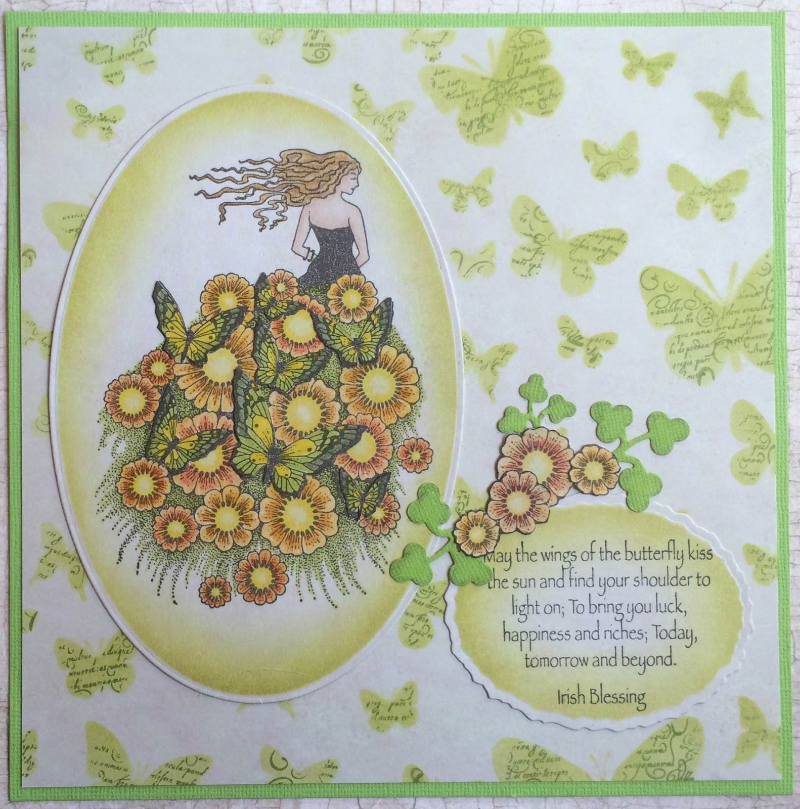 Hello everyone, I have another card using the beautiful Butterfly Dress cling mounted stamp to show you today. I decided to incorporate a bit of an Irish theme into my card, so used a palette of mainly greens to create my card.