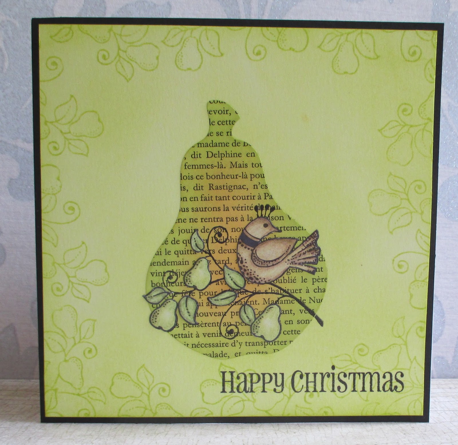 My second card was created by sponging a piece of white card with green ink, and then stamping around the edges with the end of the swirly bird and pear image, using the same colour green ink. This gives a subtle tone on tone effect. I die cut a pear image from a piece of old book paper, and coloured this with green and orange inks, before sticking it to my background.