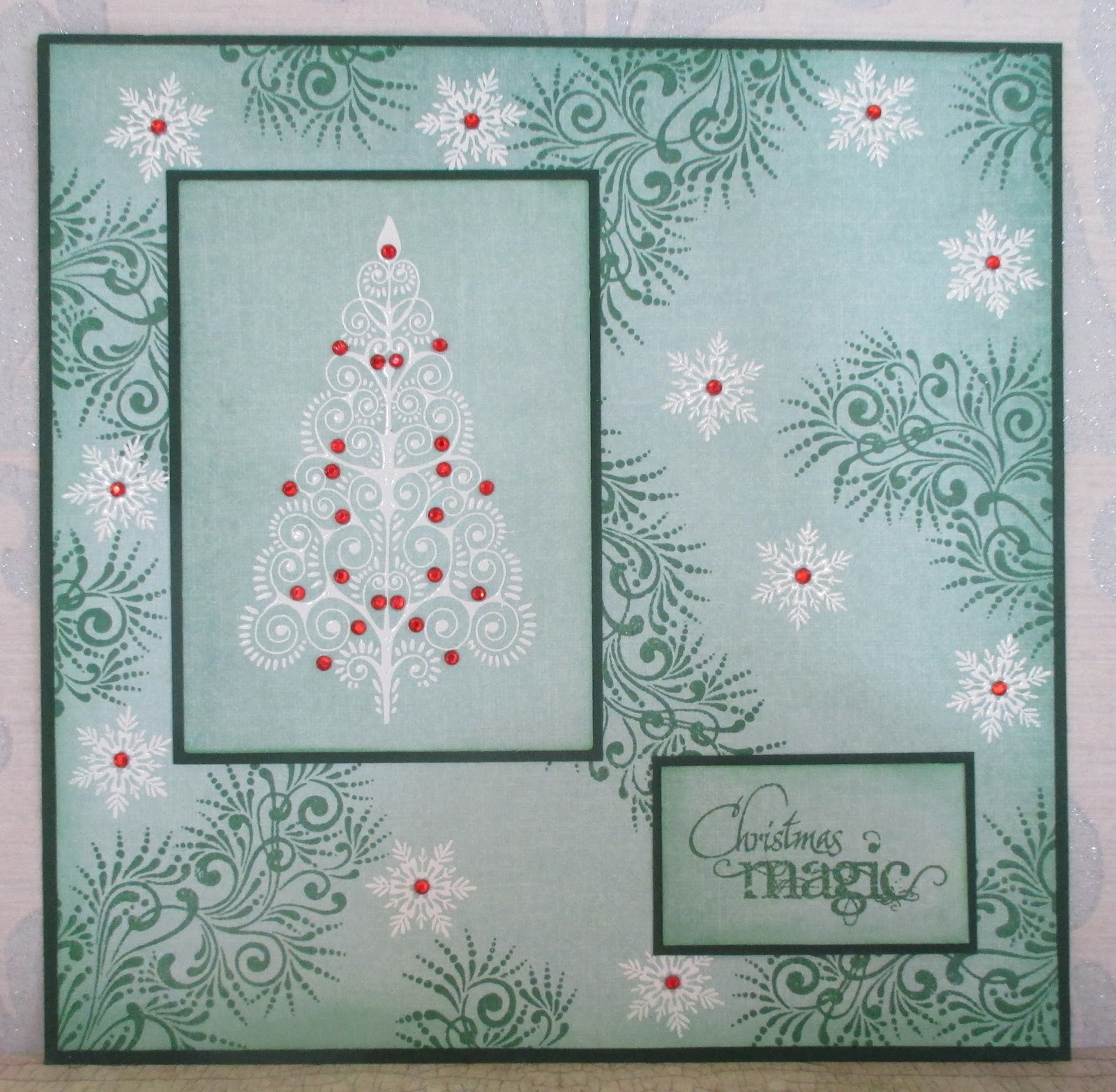 My first card uses stamps from the Snowy Scenes/Turtle Doves multibuy stamped onto green paper using white embossing powder. I added tiny red gems to the tree and snowflakes for a little bit of Christmas bling. To complete the background, I added a stamp from the Nature Fragments stamp set, stamped in dark green ink. I also stamped a sentiment from the Christmas Magic clear stamp set in the same colour onto a piece of scrap paper. I edged all of the pieces of paper with green ink and then matted them onto dark green card before assembling my project.