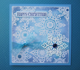My second card uses the Snowflake Shadow Big Background stamp.I have embossed the background using clear embossing powder, and then blended three different colour blue Distress Inks over the background. I have added a sentiment from the Pears and Baubles stamp sheet. I die cut a Crealie open flower which looks just like a snowflake when you cut it with white card, and matches the stamp very well. Some organza ribbon and a large gem finish the card.