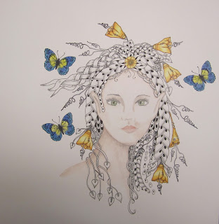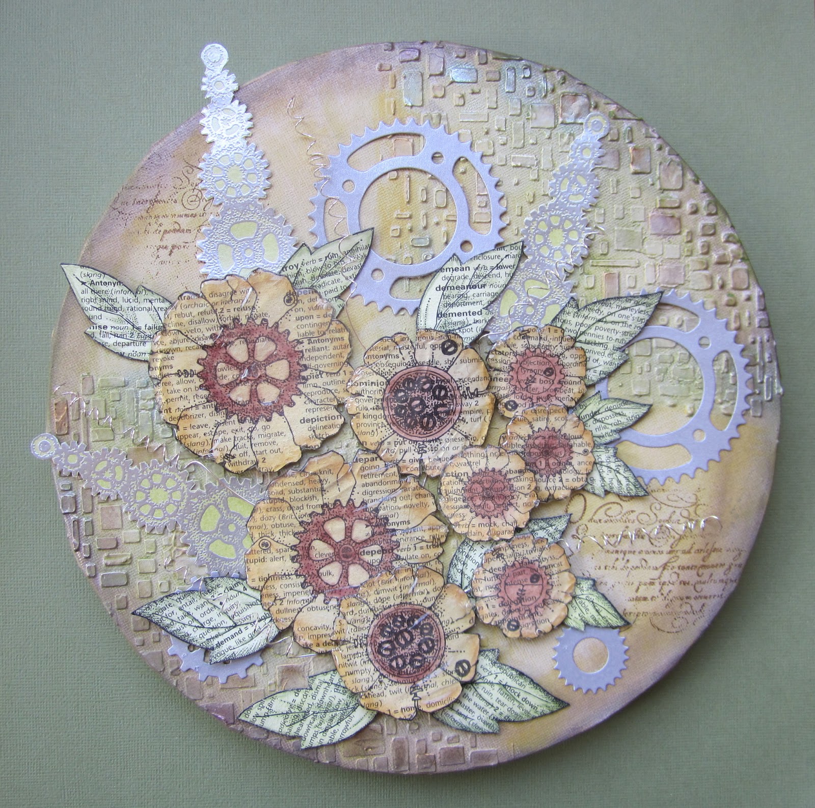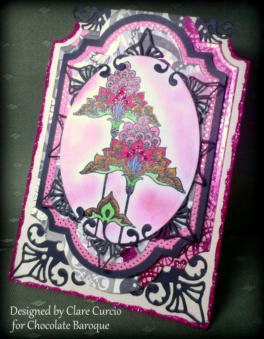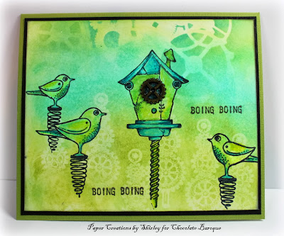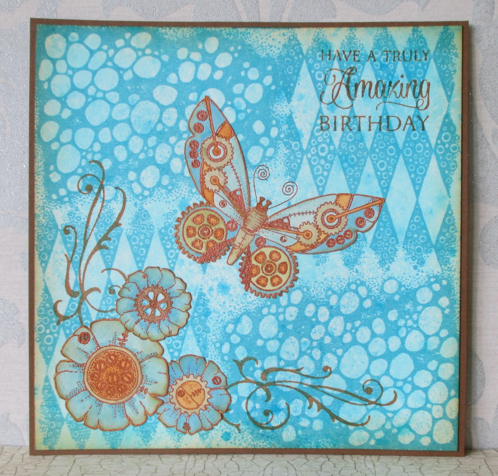 I embossed the butterfly from the Steampunk Buterfly stamp set and some flowers from the Punky Flowers stamp set, using copper embossing powder. I coloured them with water based acrylic inks. I added a stamped swirl from the Artistic Expressions stamp plate to resemble leafy tendrils behind the flowers. The sentiment was taken from the Amazing Birthday clear stamp set.
