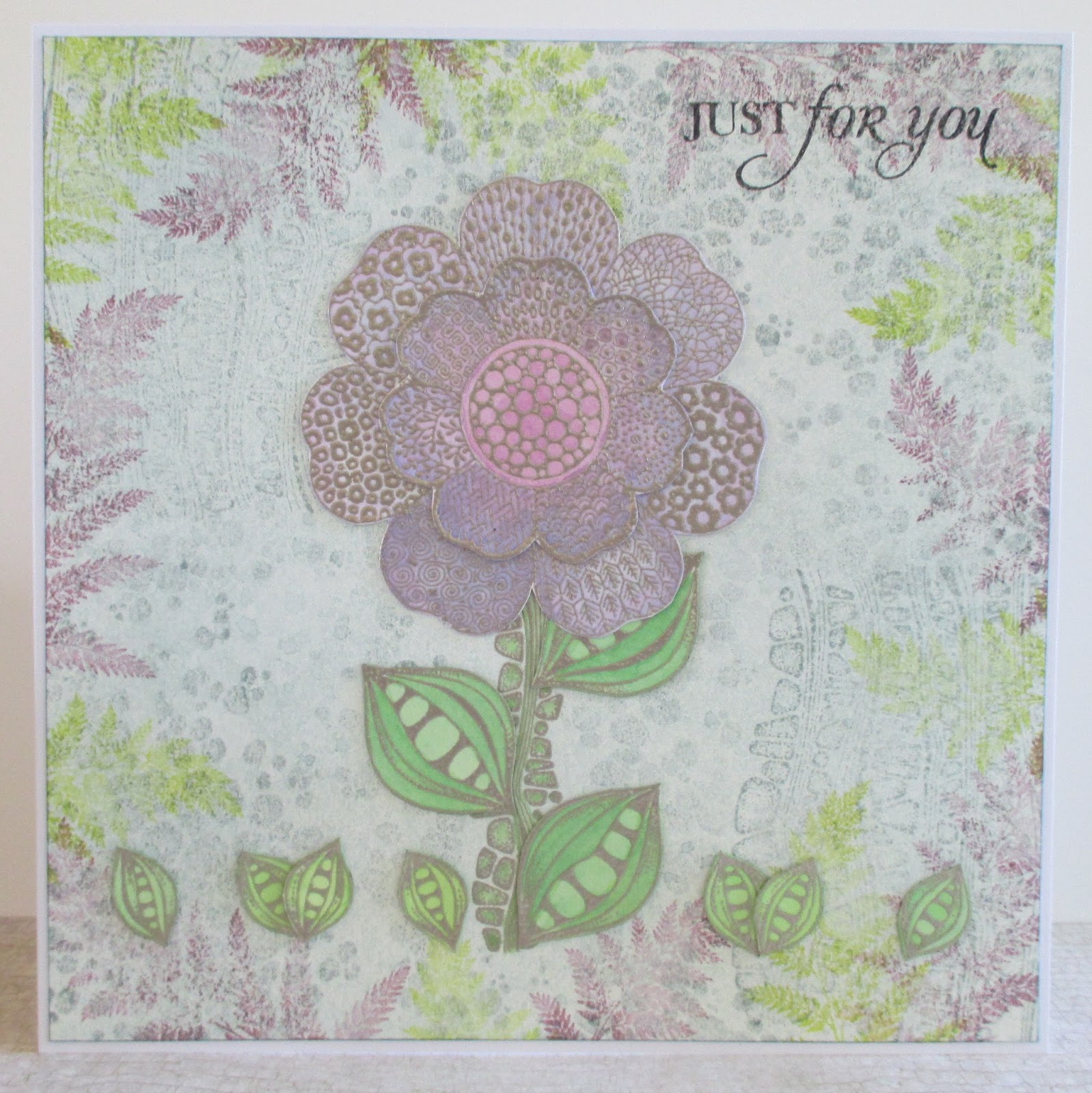 My second card was created using a piece of smooth watercolour paper, which I sprayed with diluted Distress Ink. I then stamped the dotty stamp and the stone effect stamp, using the same colour Distress Ink over the background. I embossed the single stone spine in the centre using a silver embossing powder. I added some ferns around the edges, taken from the Wild Meadow stamp set using green and purple inks.