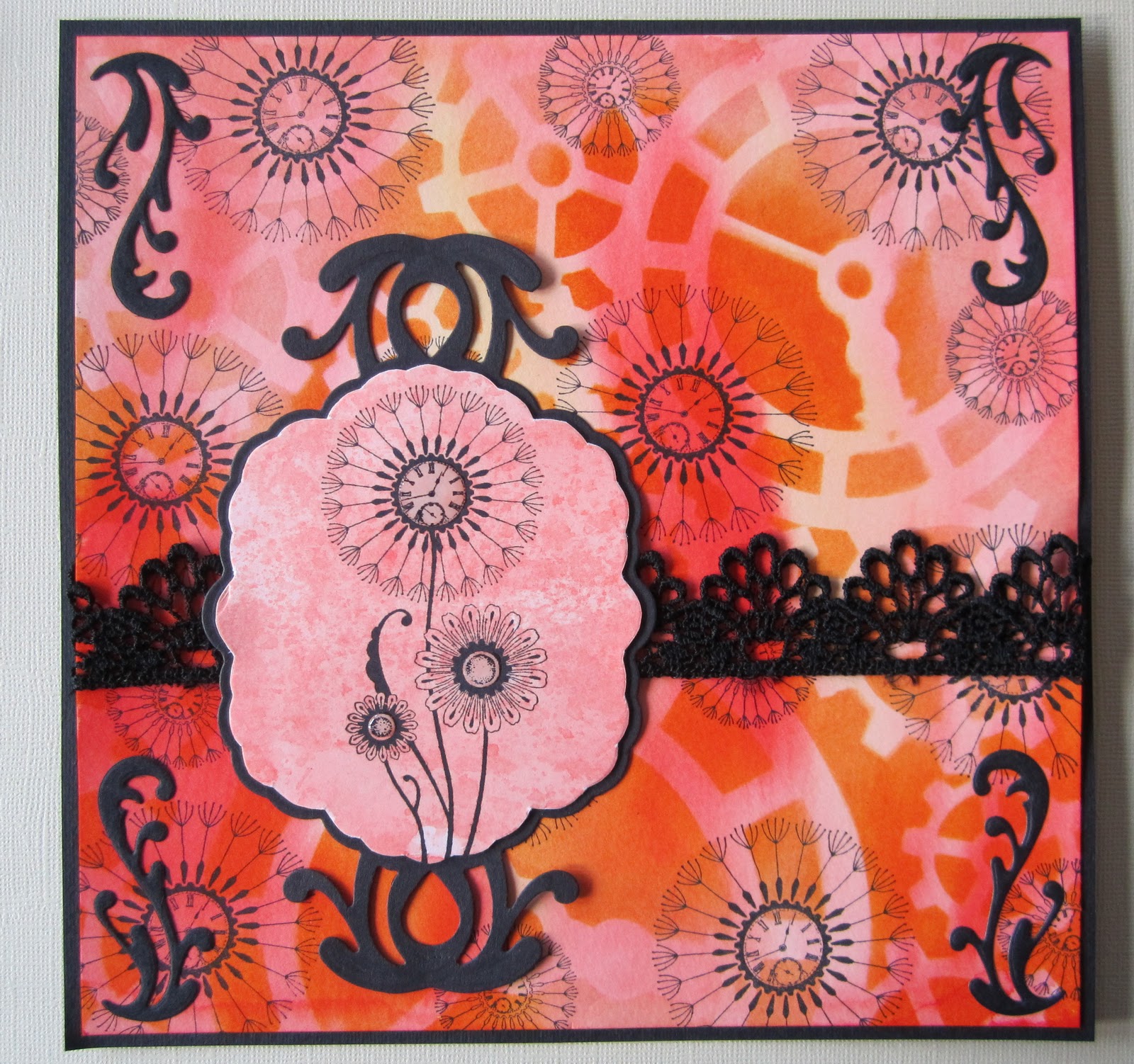I created a watercolour background, using various orange and red Ecoline inks. I then placed a large cog mask over the top, and sponged Distress Inks through the mask. I also stamped the two single dandelion clocks randomly over the background. I used a spare piece of the background to stamp the main image, before die cutting it with the die. I chose to use black card as a striking contrast to the orange tones on my card, and added Glossy Accents to the centres of the dandelion clocks.