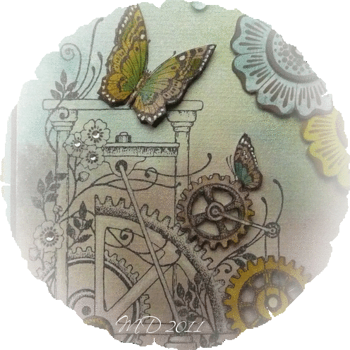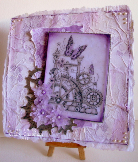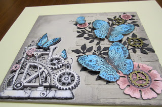 I painted a canvas with stone coloured acrylic paint, blending a couple of colours to get the effect that I wanted. I added molding paste through a brick stencil on one side to give the effect of a wall, echoing the bricks on the stamp image. I stamped the image onto tissue paper for the base layer, and added this to the canvas. I then stamped the image three times, colouring it in with Polychromos pencils. I cut the image out, and decoupaged it over the tissue paper layer. I stamped some extra butterflies and flowers from Ruby Tuesday and Patchwork Butterfly, to name just two sets, and coloured those to match. I die cut some black leaves to echo those on the stamp image, and stuck them up the textured brick area of the canvas, and added the extra flowers and butterflies. To finish, I added some metal cogs.