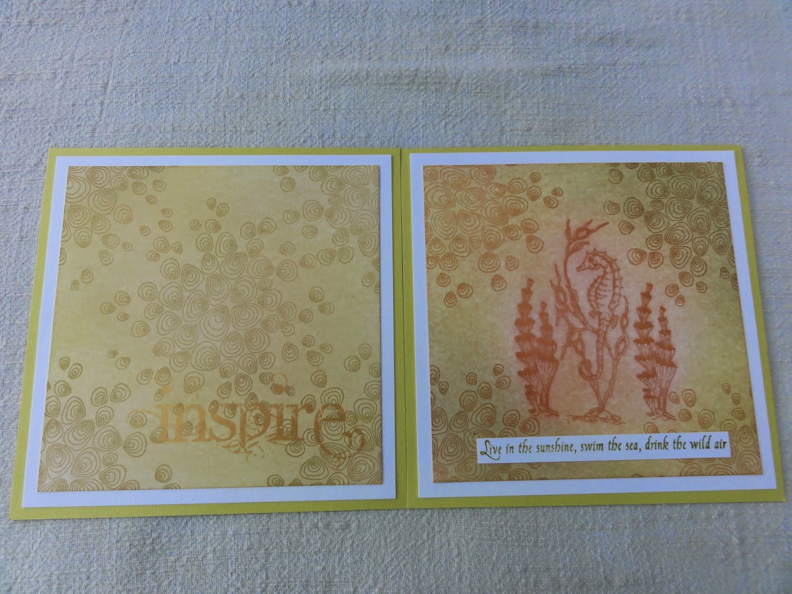 My second project is all about the calm blue waters. Here I'm using a stamp from the Harlequin Fragments A4 sheet to create bubbles and foam by inking in blue and white. The supporting cast - clouds and gulls - are from Seashore Scenes A5 sheet and Seashell Collage A5 sheet respectively. That sentiment is from Words Of Comfort And Cheer A4 sheet.