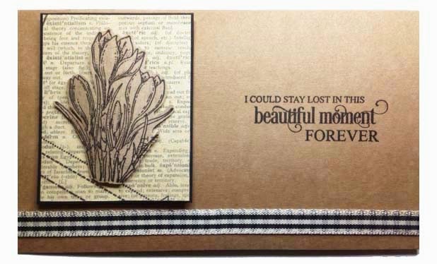 - Stamp the crocus image from Song Bird Crocus onto this plain background using Versafine Onyx Black. When dry cut around the image leaving a fine border. Curve the edges slightly to give it a little dimension and adhere to your background using a gel glue to give it some height.