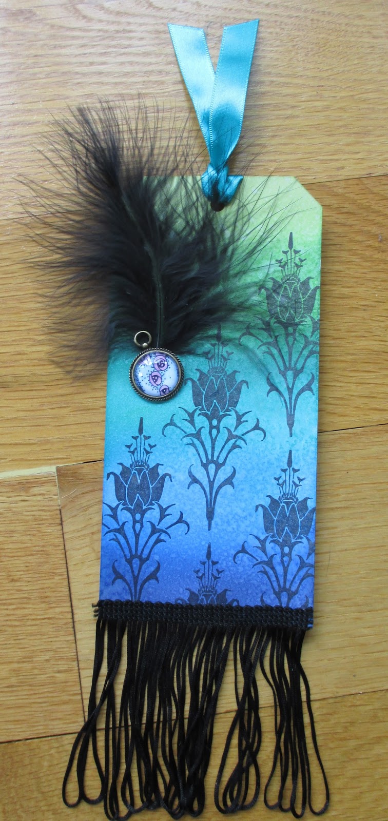 I stamped a portion of the background with one of the slihouette flower stamps from the Nouveau Lovebirds stamp set, and added some fringing and a large feather. I used a tiny portion of one of the flapper ladies dresses from the Fabulous Flappers stamp set, which I coloured with pencils, and encapsulated it into a Nautical Frame with Dome charm.