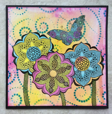 I spritzed some blue, pink and yellow spray onto a craft mat, and picking the spray up with some water, created a wash of each colour onto some more watercolour paper. I dried each piece of paper thoroughly with a heat gun. I stamped several of the Dots 'n Stripes Baroque Ornament the Tangled Baroque Ornament, plus the centre of one of the flowers from the Tangled Garden stamp set, and the clear Tangled Butterfly stamp onto the coloured backgrounds using Versafine Onyx Black ink and clear embossing powder. I cut all of the shapes out, and layered them up onto the background. I added a small amount of colour to the butterfly using water based markers.