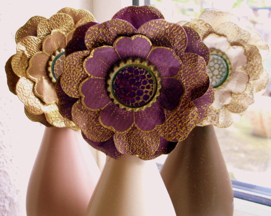 They were very quick and easy to make. I used watercolour paper as it holds its shape very well when making flowers. I coloured each sheet of paper with ink and glimmer mists until I got the colours I needed and then once they had dried I stamped the large open flower from Tangled Garden twice and the detailed flower twice on each sheet with versamark and embossed with gold embossing powder. I cut the flowers out and layered them up.