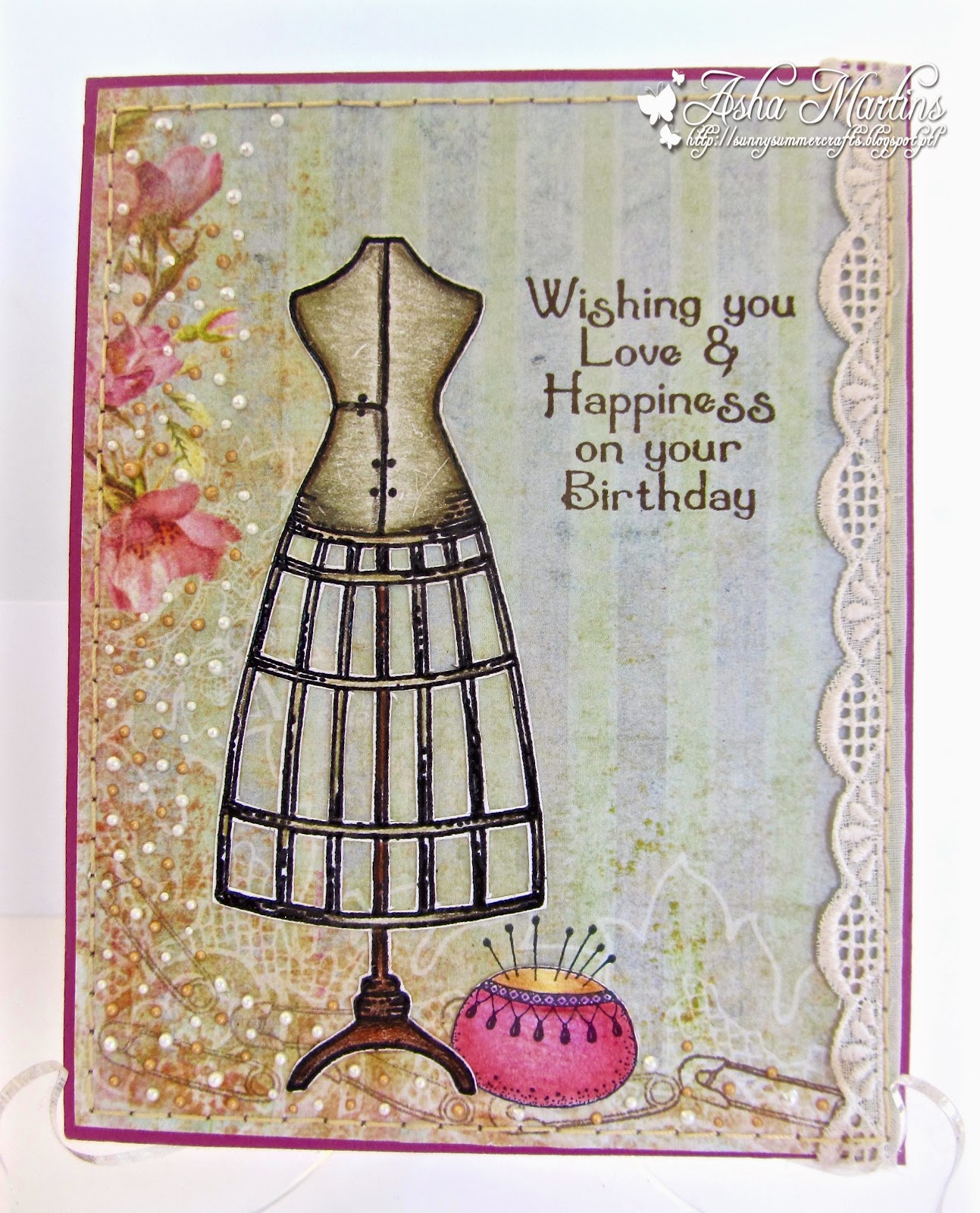 On a separate piece of card I stamped some of the haberdashery items using the grey Versafine before over stamping the vintage mannequins with black Versafine. I then coloured them with pencils before cutting out and adding them to the card with silicone glue.