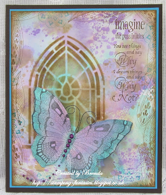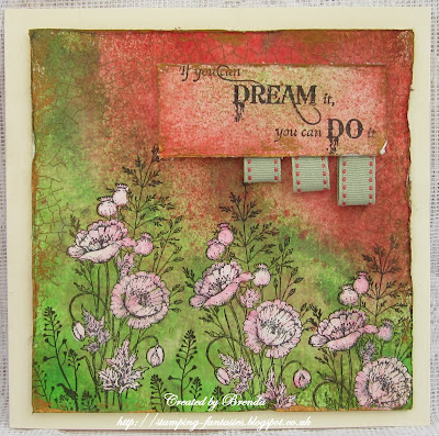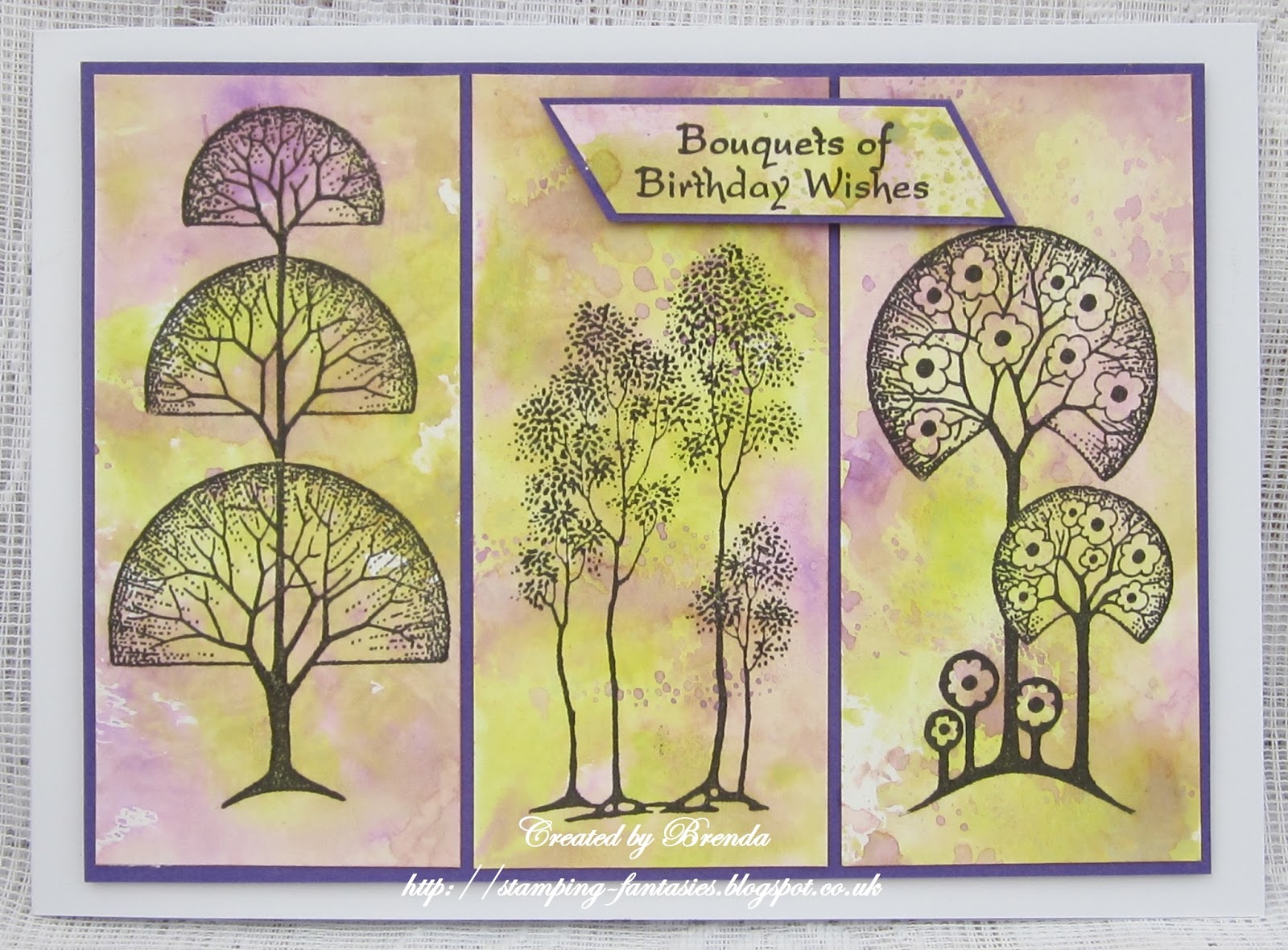 For my second card, I coloured a piece of drawing cartridge with Distress Ink, and then spritzed it with water, to achieve a mottled effect. Using the same colour ink, I stamped a tiny flower sprig from the