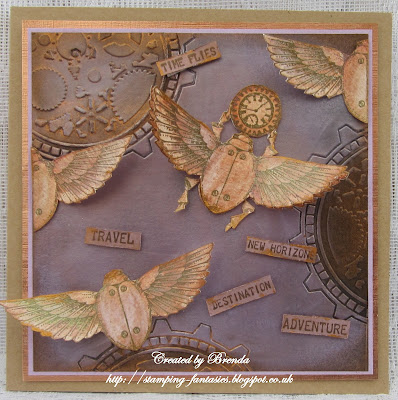 Hyacinth stamp set randomly over the background. I attached a scrap of book page, some cream lace and brown ribbon across the centre, before moving on to the focal point of the card.