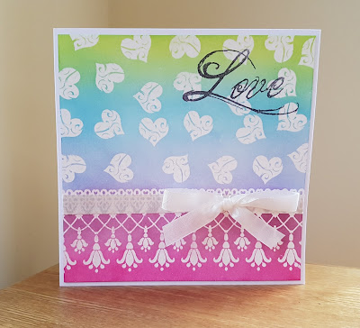 Lightly colour the roses with Victorian Velvet Distress Ink and blot with kitchen towel (to stop the stamped image from bleeding too much). Stamp the sentiment with Distress Ink. Attach the ribbon and glue to the card front.