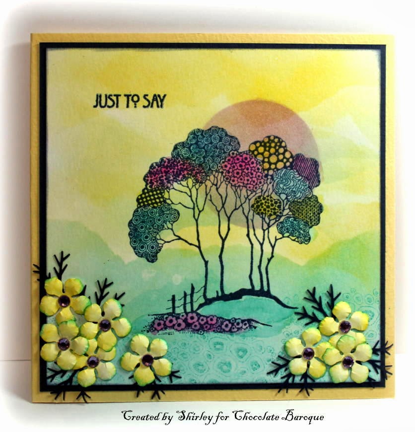 I've made 3 cards using the lovely Elegant Edges from Chocolate Baroque combined with some other sheets. The first one is made using the Gingko leaf border and the separate stamp of the Gingko leaf. I've made this one in green with gold shades. With all tree cards I' ve used my favorite technique with the acrylic bloc and Distress inks. Did some partial gold embossing and some white embossing on the little rectangle. I've used the text from the Elegant Crocus sheet. I've embossed the little gingko leaf with gold and decoupaged it.