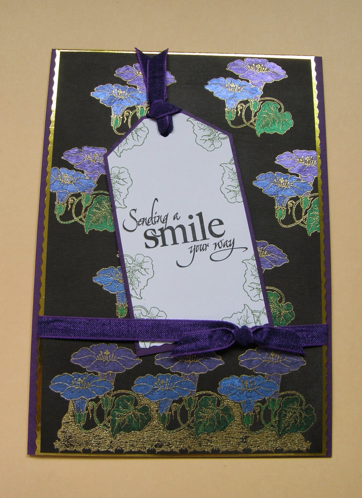 The second one has been done with the honeysuckle border and the main image is from the Fragrant Honeysuckle sheet from CB. Coloured with waterbased markers in matching colours. I've embossed the card partially with an embossingfolder and added some Inca Gold wax over it. The text is from the Loving sentiments.