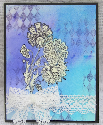 Brenda has used Brushos to create her background on the next card, then randomly stamped the harlequin stamp from Decorative Edges using Distress Ink. She stamped one of the images from Pretty Poppies, and using bleach, took away the colour from the image. Finally, she added some lace along the bottom.