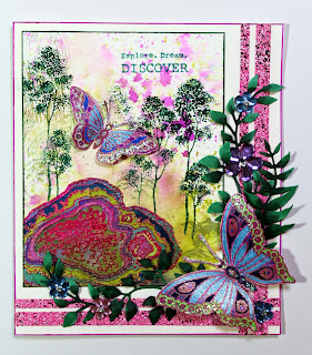 I have used ink spritzing and stamping with texture stamps to create interesting backgrounds. I have used the large gem slice stamp and heat embossing with sparkling pink powder to add a colourful textured foreground for my scene. The butterflies were also stamped and embossed, then coloured and cut out.